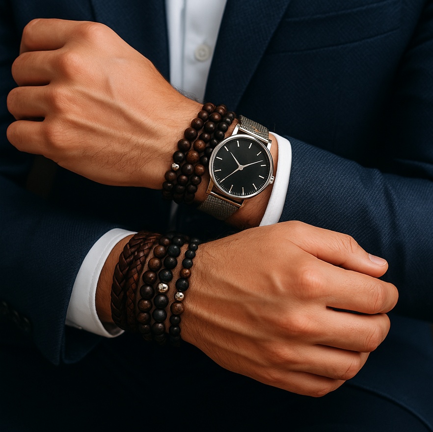 Pro běžný denní styl jsou ideální 2–4 náramky. Pro výraznější outfit klidně i více. Pro business styl stačí jeden kvalitní náramek na každé ruce – decentně a elegantně.